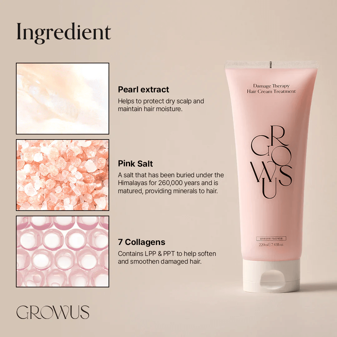 ✨ GROWUS Damage Therapy Hair Treatment EX è un trattamento intensivo della haircare coreana (K-beauty haircare) formulato per rigenerare, nutrire e rafforzare i capelli secchi, danneggiati o spenti. La sua texture cremosa agisce in profondità sulla fibra capillare, aiutando a riparare i danni causati da trattamenti chimici, styling frequente e agenti esterni.